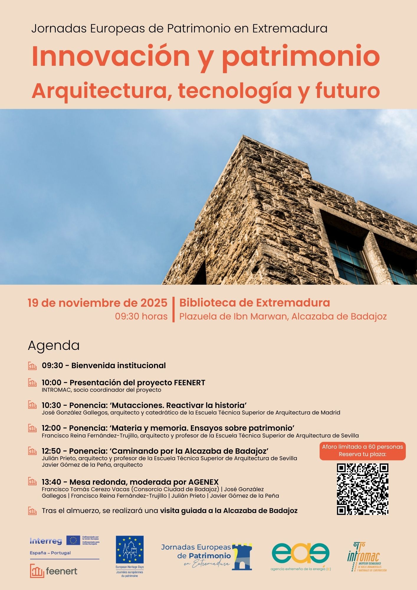 La Agencia Extremeña de la Energía (AGENEX) organiza el próximo 19 de noviembre la jornada “Innovación y patrimonio: Arquitectura, tecnología y futuro”, que tendrá lugar en la Biblioteca de Extremadura, ubicada en el interior de la Alcazaba de Badajoz.